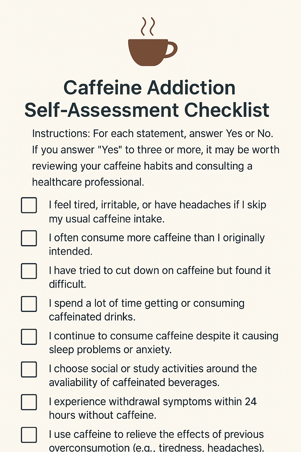 This checklist is designed based on criteria adapted from the DSM-5 (Diagnostic and Statistical Manual of Mental Disorders) and peer-reviewed research, helping you identify whether your caffeine consumption patterns may be problematic.